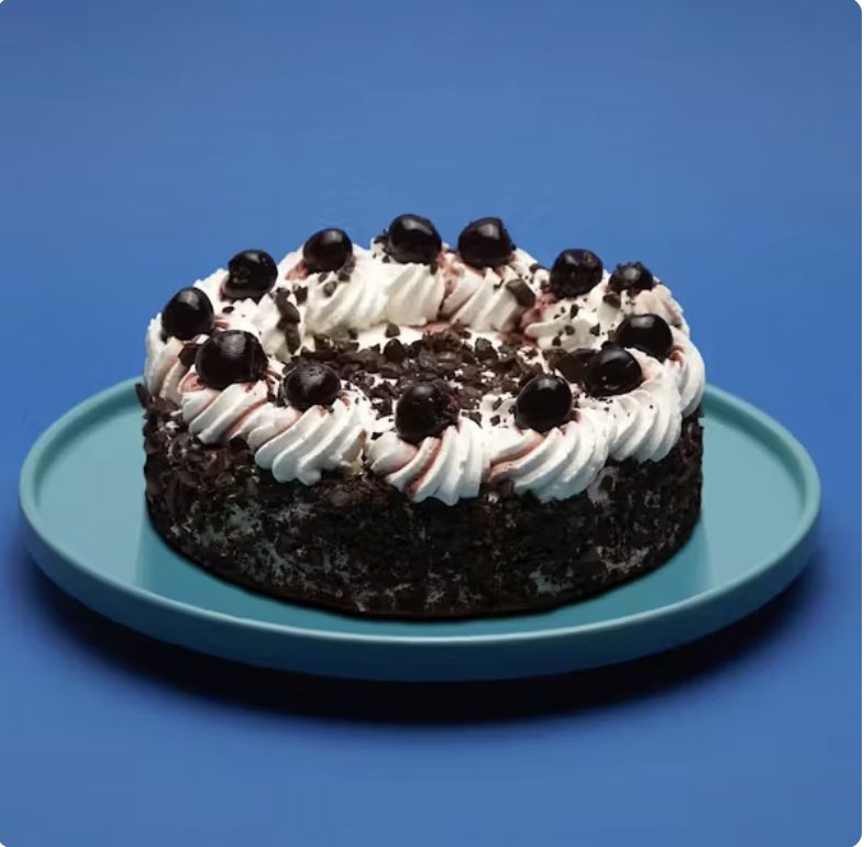 Pan di Spagna al cacao, amarene e panna, decorata con una pioggia di pepite di cioccolato
